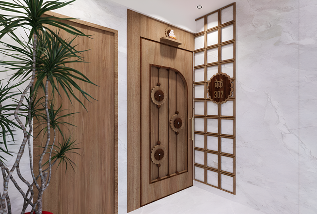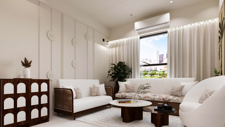 This 3BHK in Mulund blends minimal Indian aesthetics with soulful storytelling. Inspired by the beauty of showering flowers and the life phases of Lord Krishna, the home features clean lines, earthy textures, and a serene color palette. A bespoke Krishna artwork anchors the space, bringing depth, grace, and meaning to modern living.